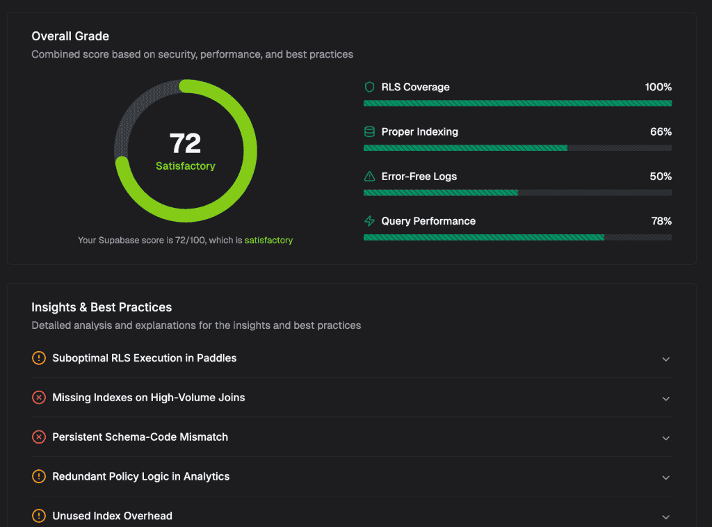 Get an automated grade on your Supabase database across security, performance, reliability, and architecture. Every finding comes with a explanations and a one-click Fix in your favorite AI tool with an easy prompt.